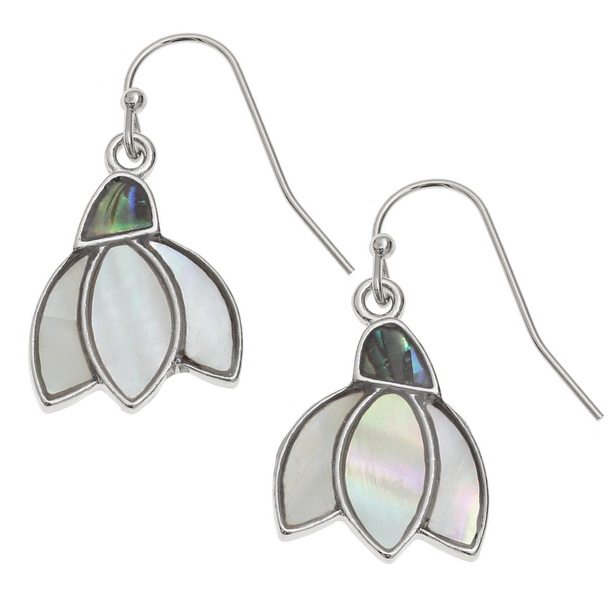 Truly delightful. A pair of snowdrop hook earrings. A base metal, nickel free is inlaid with Mother of pearl and abalone shell to bring this design to life.